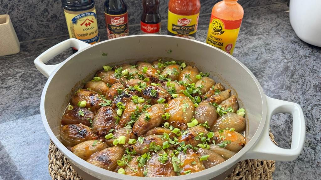 - מכינים את הרוטב: מערבבים בקערה את כל מרכיבי הרוטב ויוצקים על הבצלים בזהירות.